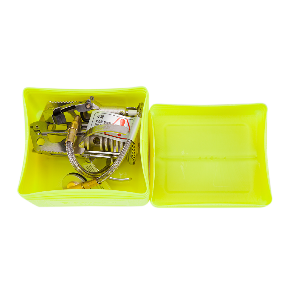 Газовая горелка компактно складывается в пластиковый кофр для транспортировки. Оснащена пьезоподжигом. Специальная сетка в головке горелки предотвращает задувание пламени ветром.