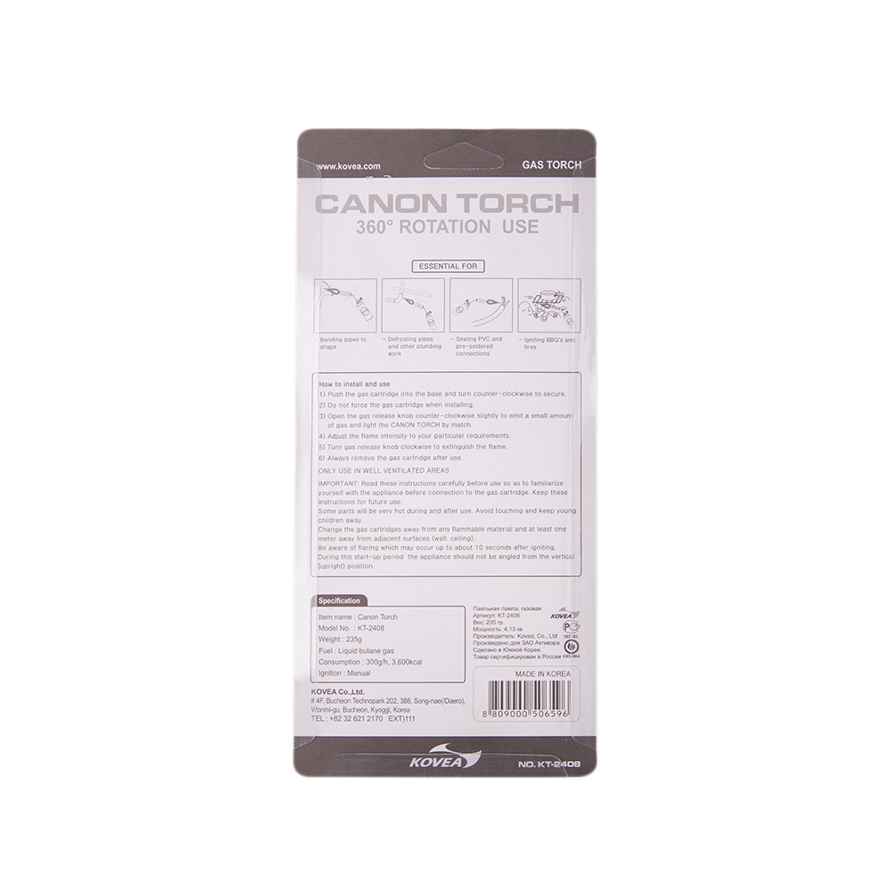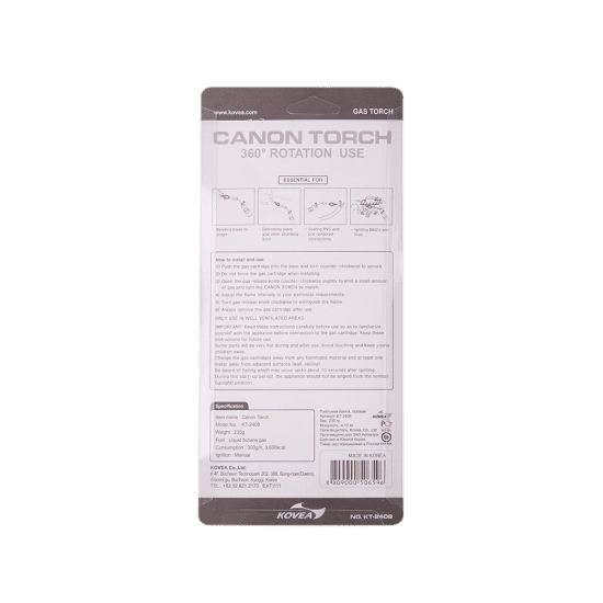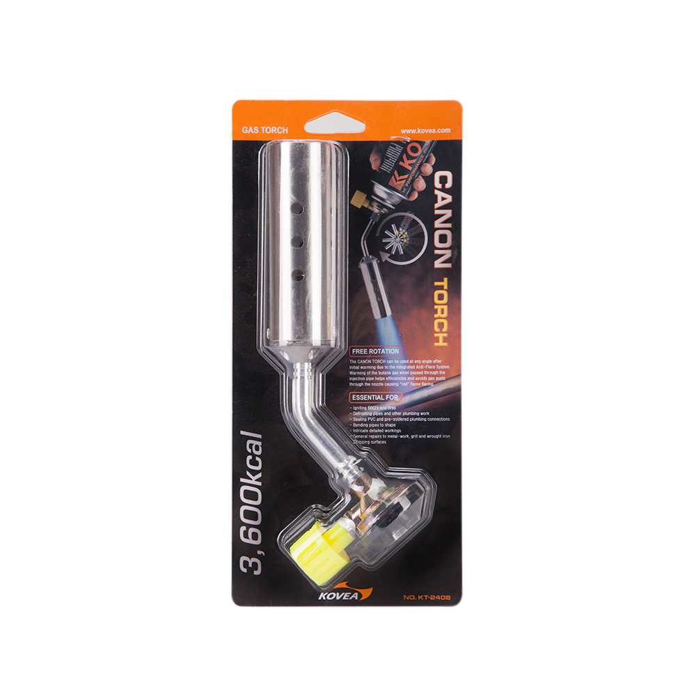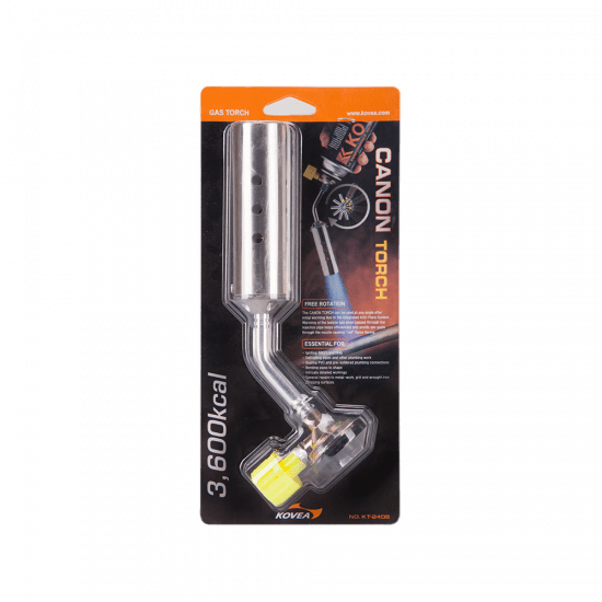 Газовый резак KT-2408 Canon Torch — самый мощный в линейке универсальный резак широкого применения, выполненный в виде паяльной лампы. Предпочтительно использовать для технических задач, где применима его высокая огневая мощь. Температура пламени достигает 1300 °C. Газовый резак оборудован системой предварительного подогрева газа, что позволяет свободно вращать резак для комфортной работы, сохраняя при этом стабильный поток пламени. Газовый резак рассчитан для работы с высоким цанговым газовым баллоном Kovea KGF-0220.