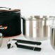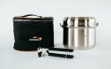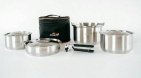 Набор посуды из толстой нержавеющей стали, рассчитанный на 5-6 человек. Состоит из трех кастрюль 1.5, 2.5, 4.0 л, с крышками и сковороды со съемной ручкой. Все предметы имеют толстое, «слоеное» дно и не имеют пластиковых деталей, благодаря чему в данной посуде пища не пригорает и можно готовить, как на открытом огне так и на углях. Толстая, высококачественная нержавейка, из которой сделан набор не имеет привкуса/запаха металла; и не окисляется во время длительной эксплуатации. Весь набор компактно складывается в чехол по принципу матрешки.