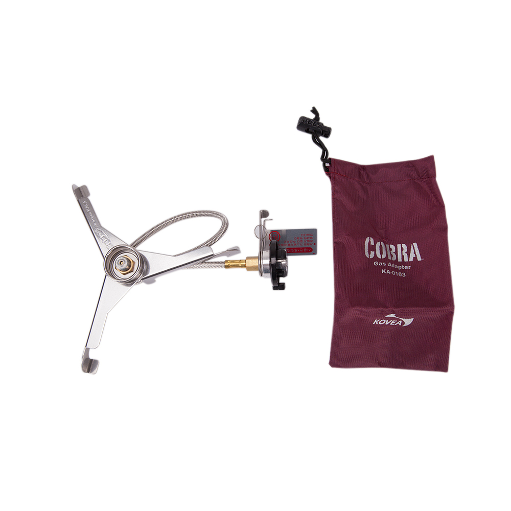 Специальный переходник со шлангом и собственной складной подставкой Cobra для горелок резьбового стандарта epi-gas на высокий цанговый газовый баллон KGF-0220. Используется для всех видов горелок Kovea с резьбовым присоединением баллона.