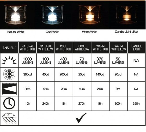 Настольный электрический фонарь в ретро-стиле с различными вариантами освещения. Подходит для освещения большой палатки или бивуака, пространства под тентом или для настольного использования. Включается долгим нажатием кнопки регулировки, режимы переключаются последующими короткими нажатиями кнопки. Мощность освещения регулируется поворотом кнопки регулировки. Работает в различных режимах от 10 до 300 часов, при мощности освещения от 50 до 1000 люмен.